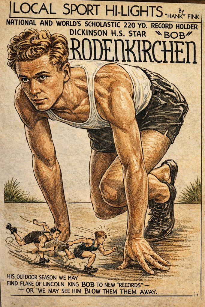 Robert Rodenkirchen built a distinguished career in track and field marked by competitive excellence, leadership, and long-term service to the sport. During his high school years (1933-36), he was often undefeated in the sprint events – 60yd, 100 yd, 220 yd. He helped to lead the William L Dickinson High School to the 1935 championship at the 23rd Dickinson High School Games at the 113th infantry Armory setting a freshman Record – 220 yard dash in 24.4 seconds (Indoor). He served as Captain of the Dickinson High School Track Team his junior and senior years during which time he set many Dickinson High School, county and state records. By the end of his senior year, he emerged as a world-class athlete.