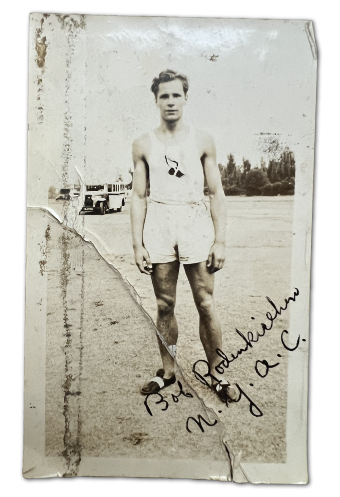 As a high school senior, he broke the world record in the 200-meter dash with a time of 21.0 seconds at the 1936 U.S. Eastern Olympic tryouts, running on a turn. Despite this performance, he was ruled ineligible for the 1936 Berlin Olympics because he had, as a young 10 year old child, immigrated through Ellis Island and was in the process of obtaining US citizenship. Jesse Owens would later beat Bob’s World Record at the 1936 Olympics in 20.7 seconds. He continued training through 1939 with hopes of earning a place on the 1940 Olympic team. However, the outbreak of World War II ended those ambitions, as both the 1940 (Tokyo) and 1944 (London) Olympic Games were ultimately canceled.